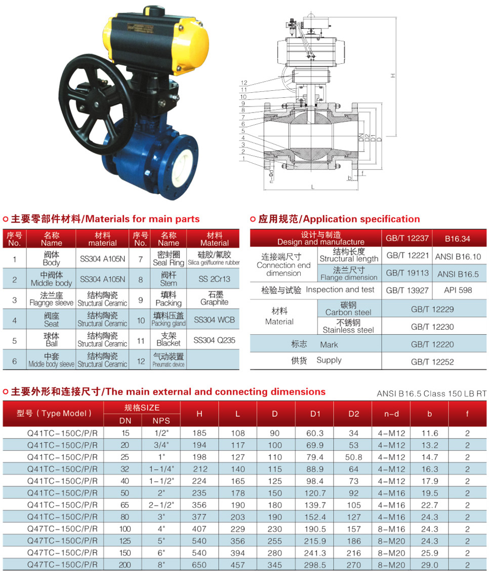 球体采用研磨设备及工艺制造,球圆度精度高、表面质量好、与阀座对研后,利用结构陶瓷的自滑润性,具有很好的密封性能。彻底改变了金属硬密封球阀易泄露、扭矩大、密封面不耐腐蚀的缺点。阀座、球体具有良好的耐磨性、使用寿命长,是钛合金阀和蒙乃尔阀的2-4倍。本阀为三片式结构,可按照GB、JIS、 API等标准数据制造。