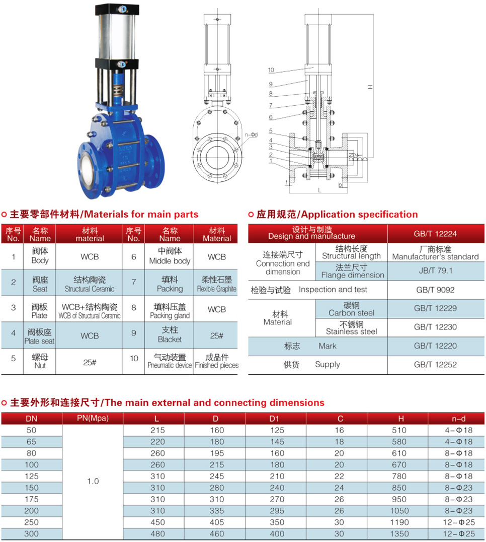 气动陶瓷出料阀采用结构陶瓷做密封件,耐冲刷、耐磨性好。撑开式双闸板密封结构,阀门关闭时双向密封;根据不同工况可设置吹扫口、灰渣漏斗,适用于干灰系统、渣浆等介质的输送系统中;积灰少,无卡涩,维护简单,使用寿命长。气动执行器采用全封闭推杆式直缸驱动,性能可靠,输出扭距大,可满足在恶劣工况条件下工作。也可适用于矿山、造纸、化工等各类有磨损的干粉尘、水、蒸汽等介质。