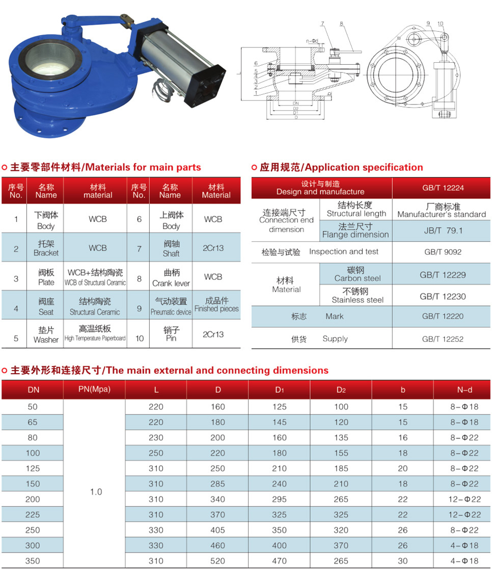 本阀主要由上阀体、下阀体、阀板、曲柄、气动装置组成。结构简单、操作灵活、重量轻、无卡阻、装拆方便;特别适用于各类磨损、腐蚀性粉尘物料、块状、团状物料的输送;垂直安装、操作方便,能随时调整开度。采用优质碳素钢铸造结构,其强度高、性能好。