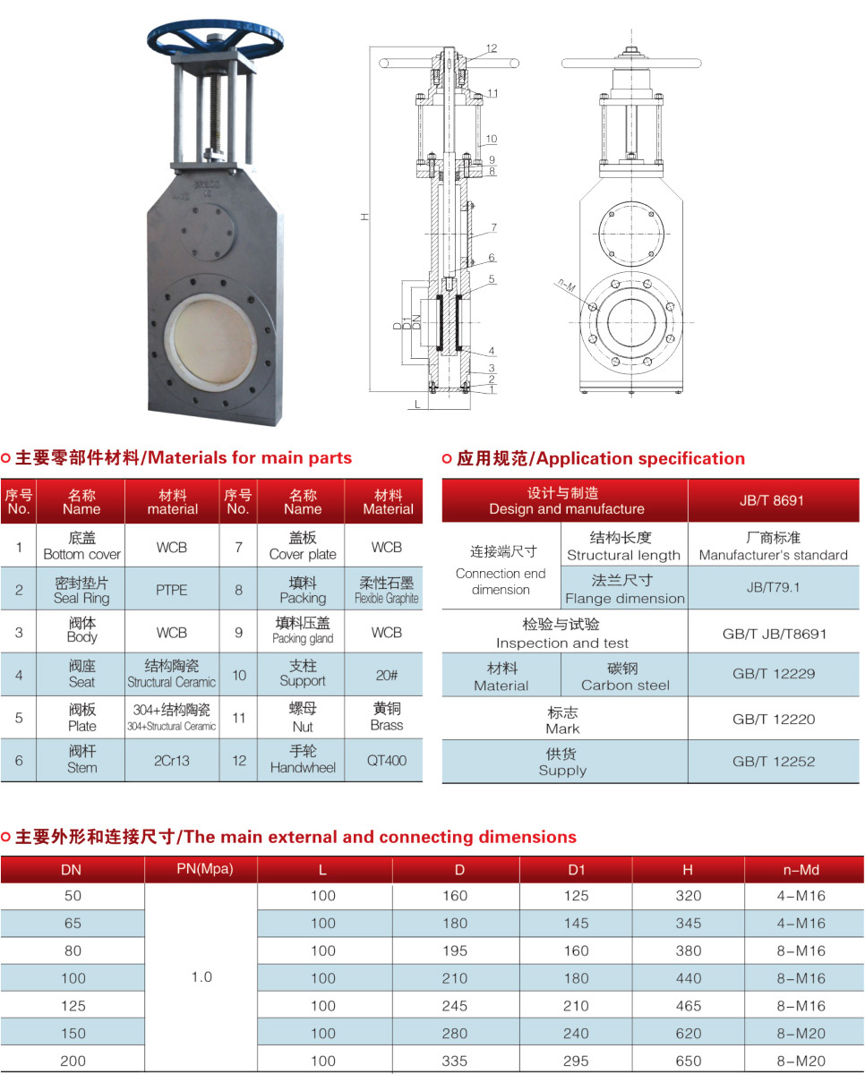 陶瓷单闸板阀又叫平板闸阀,采用法兰连接形式,根据驱动方式的不同,可分为手动陶瓷单闸板阀、气动陶瓷单闸板阀;本阀采用结构陶瓷做密封副介质渣道,表面均采用陶瓷制造,密封可靠、整体结构紧凑、硬度高,耐冲蚀、寿命长。使用范围为热电厂干灰系统仓泵进出料阀;选煤厂重介质管路系统中管道切换阀;矿山、化工等各类有磨损的干灰、渣水等介质的管道的启闭阀。