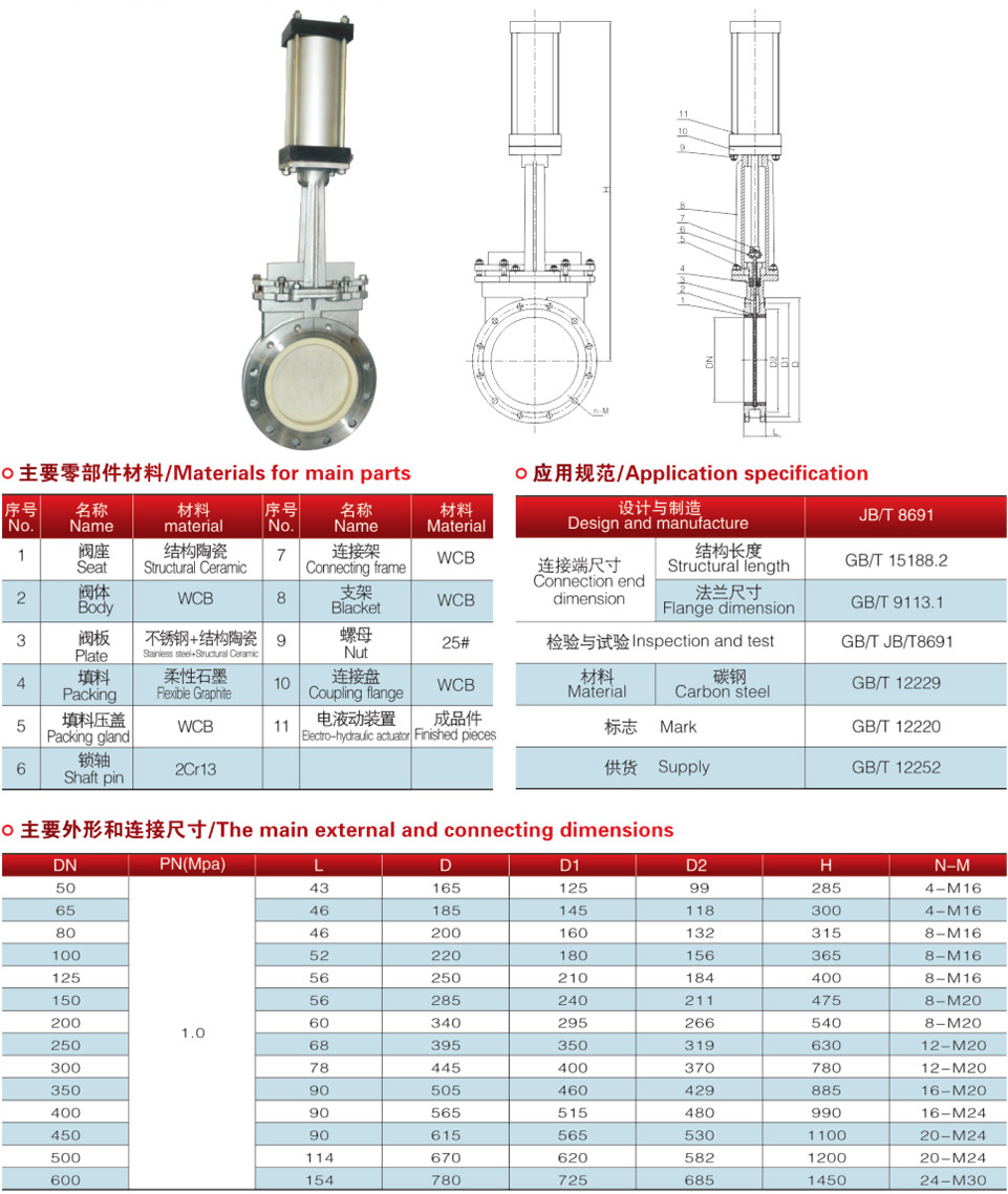 闸板、阀座密封面材料采用结构陶瓷制造,耐磨损、耐腐蚀、抗高温、密封面采用硬密封与介质接触的部分均为结构陶瓷材料,其化学稳定性及硬度极高。因此,本阀具有极高的耐磨损、耐腐蚀、耐冲蚀性能,且隔热性好、热膨胀小。
