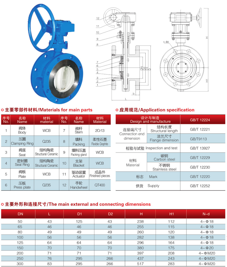 陶瓷蝶阀是一种结构简单的调节阀,也可用于低压管道介质的开关控制采用结构陶瓷做密封副,其优良的耐腐蚀、耐高温、耐磨损及耐冲蚀性能可广泛应用于石化、冶金、造纸、电站、炼油、煤炭等行业的各类酸碱盐气体、液体、高温蒸汽、泥浆和灰渣输送系统中作调节流量或切断介质。运动部分均采用结构陶瓷材料,弧面接触加工。采用偏心结构,减小运动部分的摩擦,延长阀门的使用寿命。蝶阀部分材质可依用途更换,适用于多种高磨损、高温、高腐的特殊工况。驱动方式有手动、气动、电动等。小巧轻便,容易拆装及维修,并可在任意位置安装。结构简单、紧凑,操作扭矩小,90°回转开启迅速。流量特性趋直线,调节性能好。