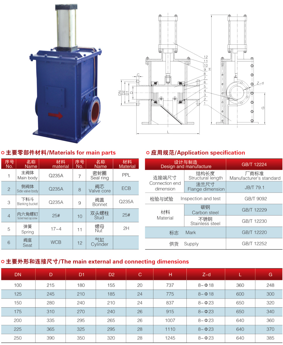 本阀门用于电力工业气力输灰系统管道上,做为灰库之间切换装置。当气缸带动芯下行时,与两端通道接通,此时干灰通过管输送到另一座灰库,当气缸上行时,干灰由下料斗引向下方,直接落入灰库。